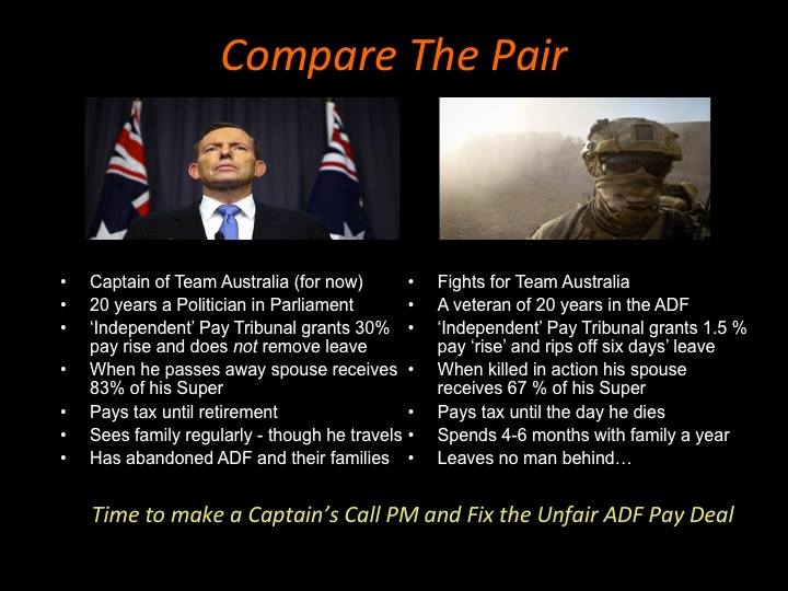 It’s also a shame the Remembrance Day statement seemed to be overshadowed by his recent decision to cut wage increases for the Australian armed forces. Tasmanian PUP Senator Jacqui Lambie even botched together a meme of sorts (presumably using powerpoint?). Despite the poor layout, it conveyed an effective message about the PM’s attitude to the wages and conditions of the service men and women that were often tasked to join him in Putin-like photo opportunities.